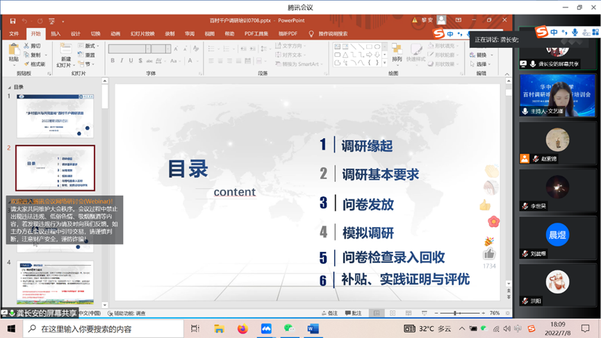 百村调研核心成员、williamhill中文博士龚长安进一步从防疫规定、调研安全、调研态度、问卷质量、问卷版权等方面强调了本次调研的基本要求;从问卷结构、调研准备、访谈技巧、问卷填写、问卷检查与录入、问卷回收与质检等流程开展模拟调研;并解读了问卷发放过程中所有材料的使用指南,介绍了调研征文的选题,以及说明调研补贴与实践证明发放等问题。