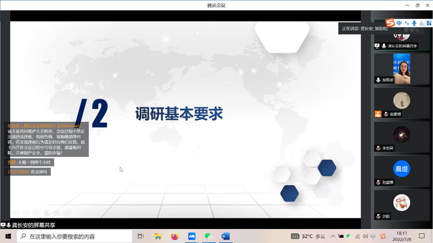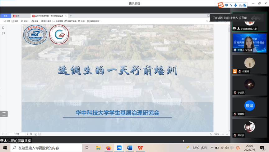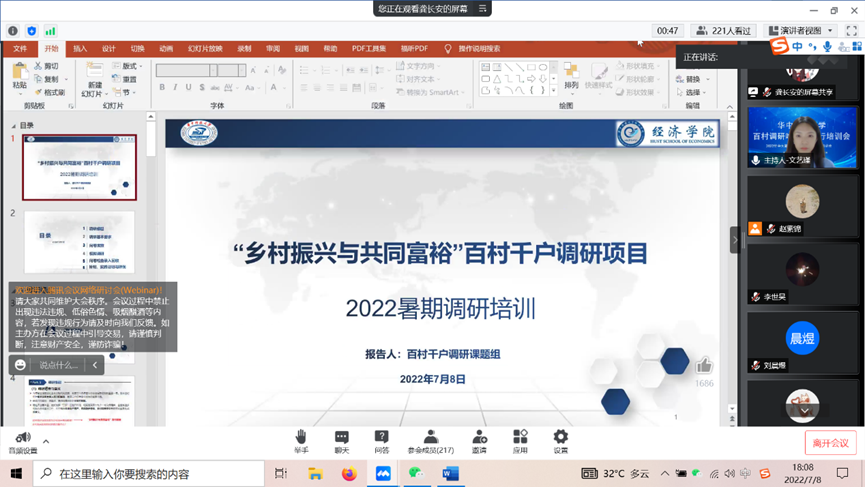 (通讯员:郑冯忆)2022年7月8日下午18:00,由威廉官网中国校团委、学工部研工办以及williamhill中文联合举办的2022年暑期“乡村振兴与共同富裕”百村千户调研暨喻竹实践行培训会于腾讯会议成功举办,来自威廉官网中国的“喻竹计划百人团”、“选调生的一天”、“返乡调研”三支队伍,近300名调研员参加了本次培训学习。williamhill中文院长、教授张建华,williamhill中文团委书记李曼菁、辅导员李世昊参加了本次会议。