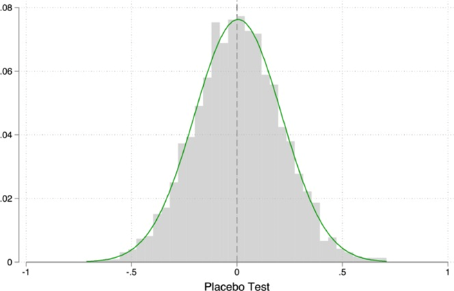 为了进一步证明研究结论是来自于竞争而非其他因素。文章进一步将原始样本随机指派为 “受影响组”和“不受影响组”。然后对新的样本再次进行前述的双重差分回归。如果上述结果来自于竞争之外的因素,那仅仅针对竞争的随机分组应该不会系统影响前述结果的显著性。随后,研究执行了5000次的随机分组并进行回归分析。5000次回归的系数分布如下图所示,可以看到,系数近似于均值为0的正态分布。均值检验显示,系数与0之间的差异在统计上不显著(t-val = 0.38),这意味着研究结果不太可能纯粹由竞争之外的偶然因素驱动。