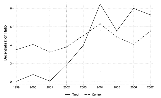 该文探讨了产品市场竞争对国有企业治理模式的影响。基于产品市场的外生冲击(中国加入WTO),研究构造双重差分检验并发现市场竞争极大地加快了国企改革,且有效促进了国有企业的管理权在不同政府层级之间的下放。下图展示了面临更强市场竞争水平的国有企业(以实线表示)与对比组的企业(以虚线表示)在市场竞争发生变化前后,企业管理权在不同层级政府之间下放的基本情况。可以看到,在冲击发生之前,受竞争影响更大的企业的明显低于对比组的企业,二者的差异相对稳定;然而,在事件发生后,对于那些明显受到竞争影响的企业,其政府控制权的下放则出现了大幅提升(从2%到5.5%左右)。