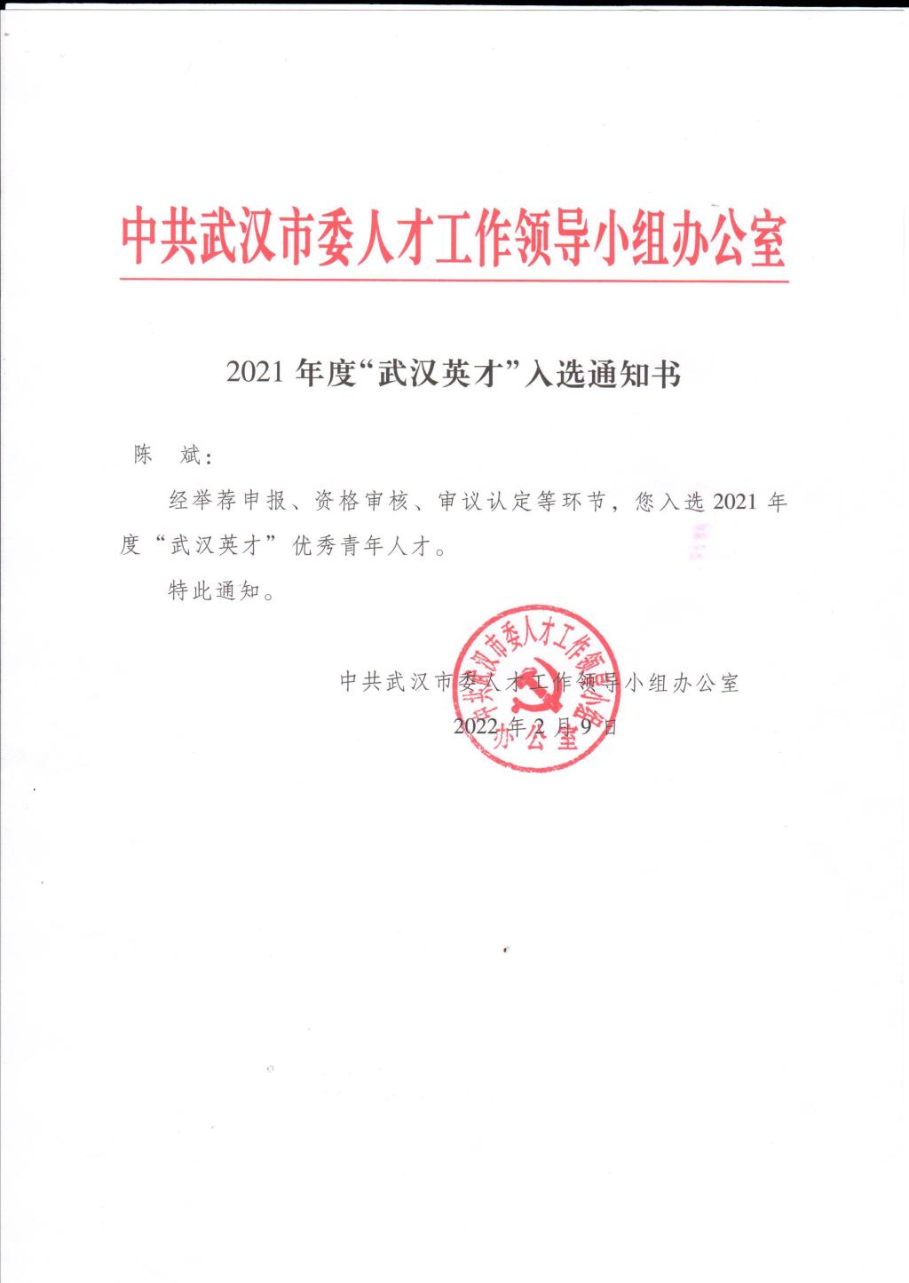 本网讯(通讯员 王彬)日前,武汉市组织部公示了2021年度“武汉英才”人选名单,我院陈斌教授入选。