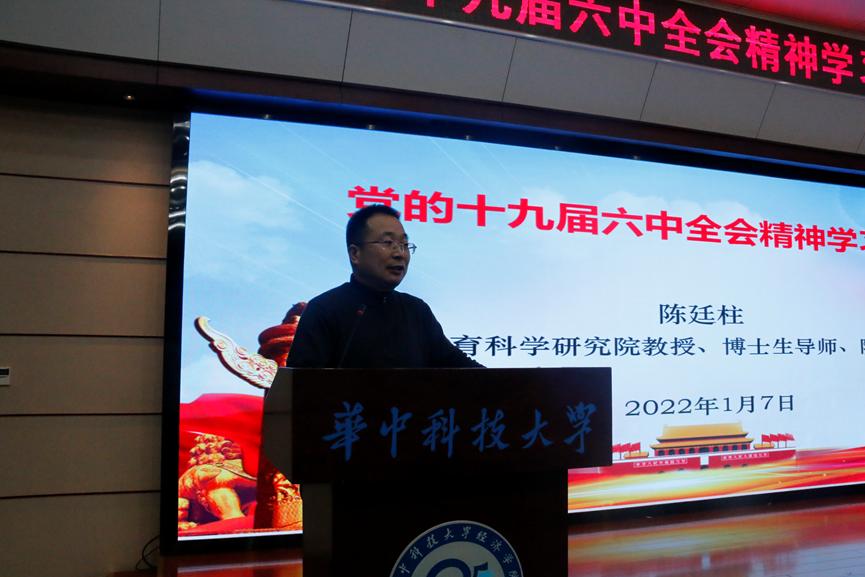 本网讯(通讯员:范乐怡)2022年1月7日下午,williamhill中文、公共管理学院党的十九届六中全会精神宣讲报告会在williamhill中文学术报告厅举行,威廉官网中国教育科学研究院教授、博士生导师、院长陈廷柱老师为师生作党的十九届六中全会精神宣讲。williamhill中文党委副书记崔金涛老师主持会议。