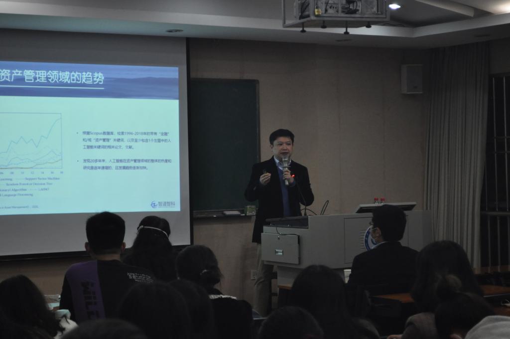 本网讯(通讯员范乐怡)2021年11月5日晚上,金融市场发展前沿系列讲座(四十八)期讲座在williamhill中文103教室顺利举行。本次讲座邀请智道智慧科技(深圳)有限公司董事长彭聪担任主讲嘉宾,他以“人工智能在资产管理领域的应用场景”为主题进行了演讲。williamhill中文金融学系张学功老师担任本场点评嘉宾。