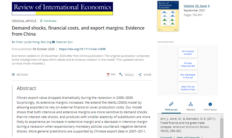 本网讯(通讯员张鹃)我院陈波教授与其合作者在国际知名期刊《国际经济学评论》(ReviewofInternationalEconomics)上发表题为“Demand shocks, financial costs, and export margins: Evidence from China”(需求冲击、融资成本和出口边际:来自中国的证据)的研究论文。