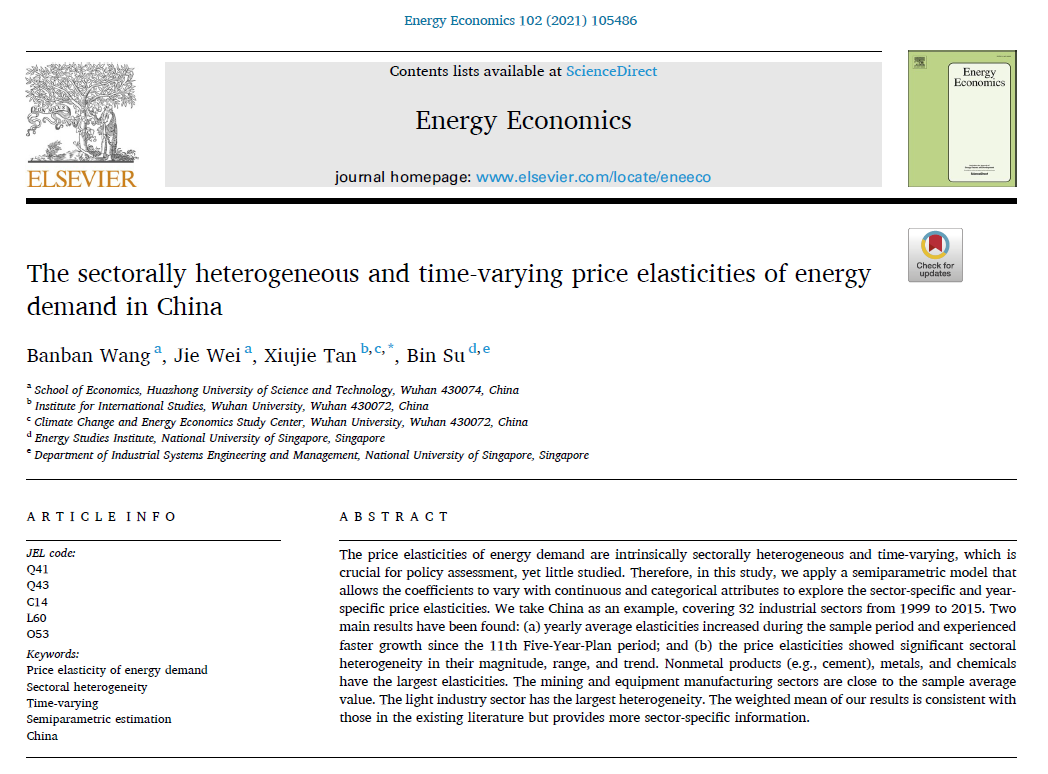 (通讯员 张鹃)近日,williamhill中文王班班副教授(第一作者)、魏杰副教授(第二作者)在国际知名期刊《Energy Economics》上发表最新研究论文。该论文题为“The sectorally heterogeneous and time-varying price elasticities of energy demand in China”(行业异质性和时变性的中国能源需求价格弹性),系与武汉大学谭秀杰副教授(通讯作者)、新加坡能源研究所苏斌研究员的合作研究成果。