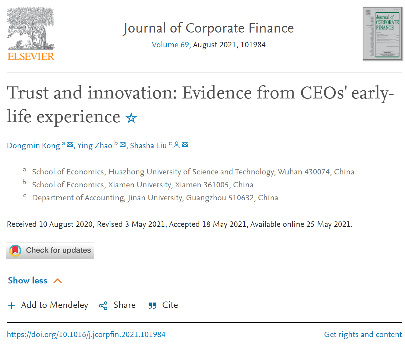 论文二的题目为:Trust and innovation: Evidence from CEOs' early-life experience。赵莹同学的论文考察了公司CEO的信任水平对于公司创新的影响。基于不同的数据集,论文利用上市公司CEO早期的生活经历来衡量信任水平,并采用双重差分策略识别信任对企业创新的因果关系。研究发现信任显著提升了公司创新。文章进一步证明了非正式制度和正式制度之间的替代效应。整体上,论文通过是评估信任这种非正式制度真实效应——对于企业创新的影响,做出了一定的边际贡献。
