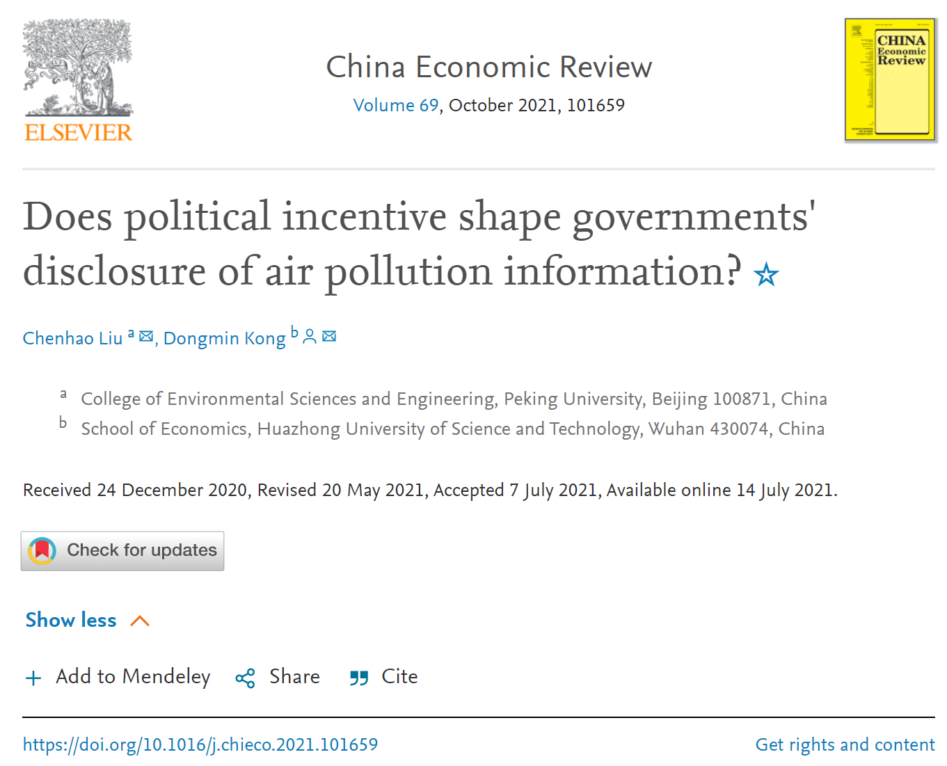 论文一的题目为:Does political incentive shape governments' disclosure of air pollution information?。刘宸昊同学的论文探讨地方政府激励如何影响空气污染信息的披露,并进一步分析背后的影响机制。文章基于一种新的计量方法,聚束估计(bunching estimation),识别了地方政府公布的大气污染指数的失真与地区差异。进一步的分析表明,地区激励显著影响了地区的环境信息披露。2013年我国引入地方环境信息的即时披露政策显著提升了地方调整环境信息的成本,从而有效的约束了地方政府的环境披露行为。总体而言,本文通过识别环境信息披露的失真,调查其内在原因,并检验新的信息披露政策在塑造地方环保信息披露行为方面的有效性,做出一定的边际贡献。