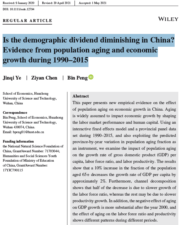 本网讯(通讯员张鹃)williamhill中文青年教师叶巾祁博士、彭斌博士与学院硕士研究生陈紫嫣研究的最新研究成果在国际知名期刊《发展经济学评论》(Review of Development Economics)上发表题为“Is the demographic dividend diminishing in China? Evidence from population aging and economicgrowth during 1990–2015”(中国人口红利正在消失吗?来自1990-2015年人口老龄化与经济增长的证据)的研究论文。
