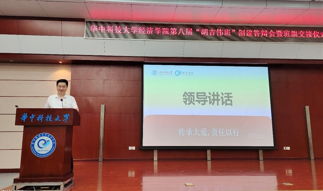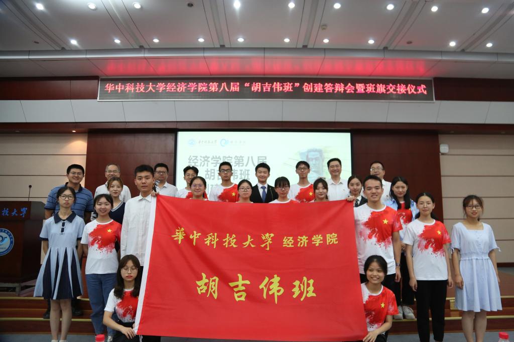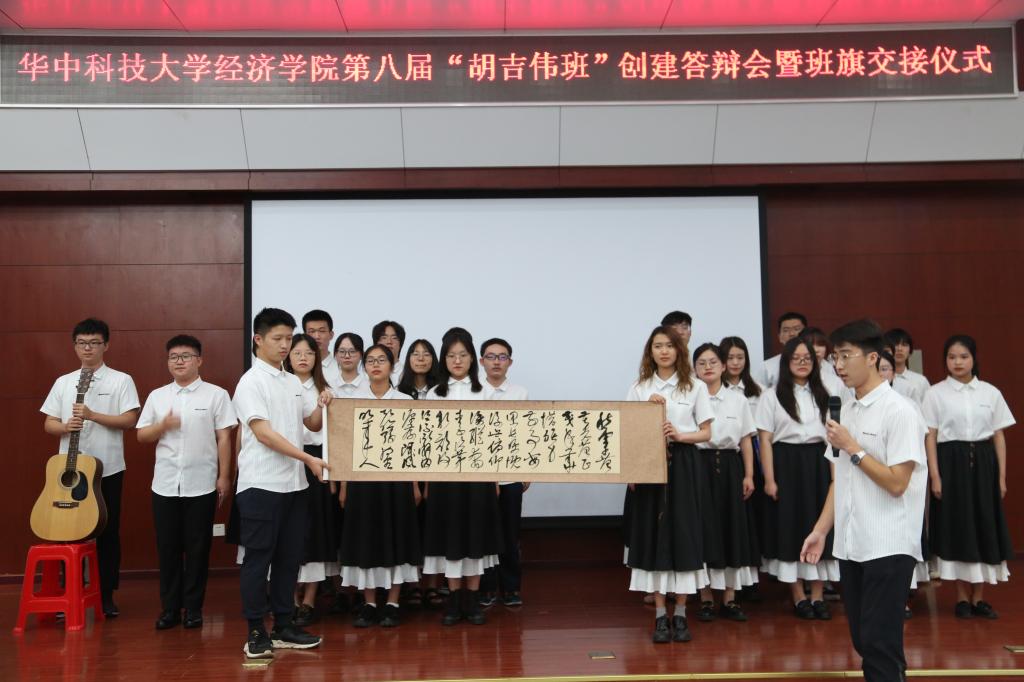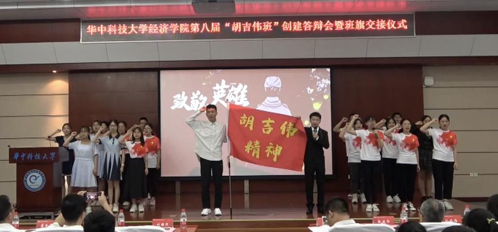 答辩结束后,第七届胡吉伟班学生代表彭连胜同学上台发言,他回顾了班级四年的成长历程,分享他们对吉伟精神的阐释和践行。接着,校党委组织部副部长林岚公布答辩得分,宣布国商2001班在此次评选中获胜,并获得第八届williamhill中文“胡吉伟班”的光荣称号。williamhill中文党委副书记崔金涛老师为新一届“胡吉伟班”授旗。