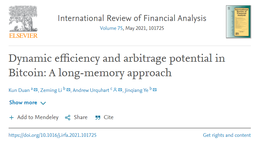 论文一:“Dynamic efficiency and arbitrage potential in Bitcoin: A long-memory approach”(比特币市场效率与跨市场套利行为的动态联动研究:基于一种新型的长记忆协整分析方法)。有效市场假说理论自提出以来,其作为分析资产市场效率与价格泡沫的重要理论基础,已在金融与经济领域中广泛应用。然而,受限于时间序列仅存在整数单位根的传统假设,以往基于市场效率视角的相关研究仅能够检验市场是否有效,无法具体测度实际市场与有效市场状态之间的距离,即市场效率强度,因而导致该视角的应用面仍较为狭窄。本文以全球五大比特币交易市场作为研究样本,通过允许分数单位根的存在,测度价格序列不同单整阶数下的市场效率强度。在此基础上,使用分数向量协整(FCVAR)模型,分别从短期非均衡和长期均衡市场状态下,探究各市场效率强度对跨市场套利行为的影响效应。