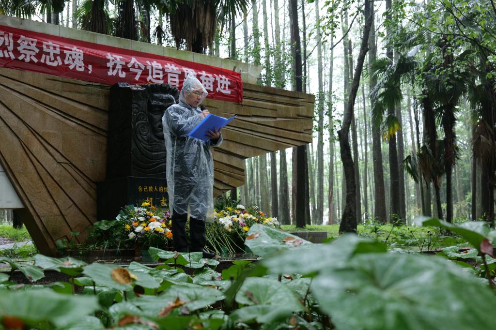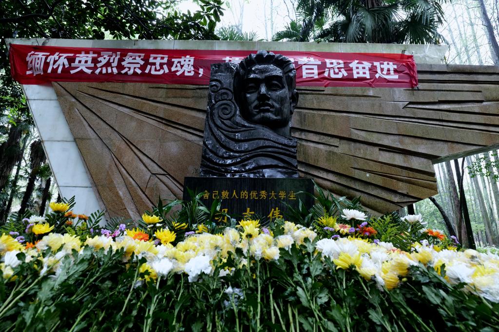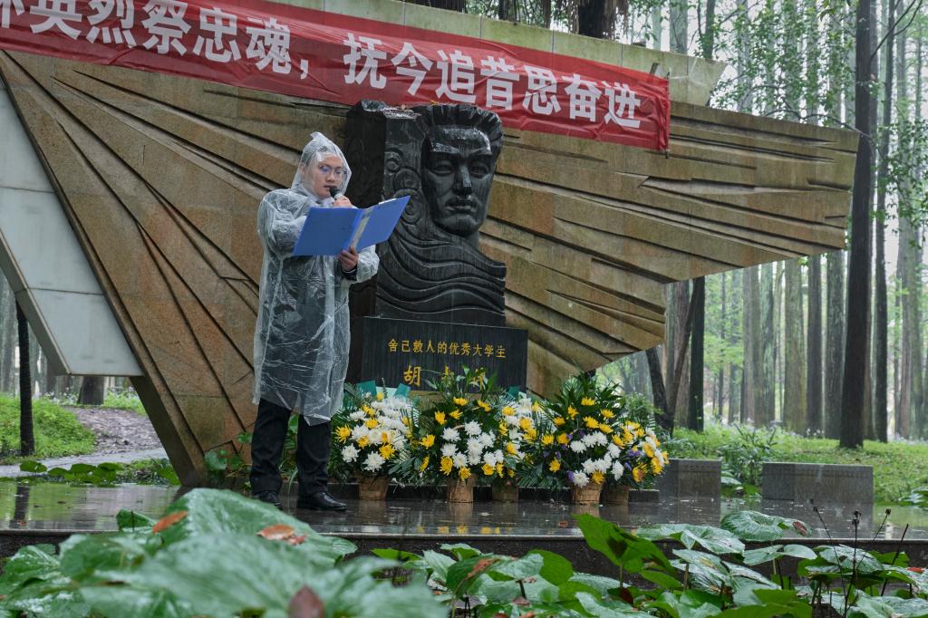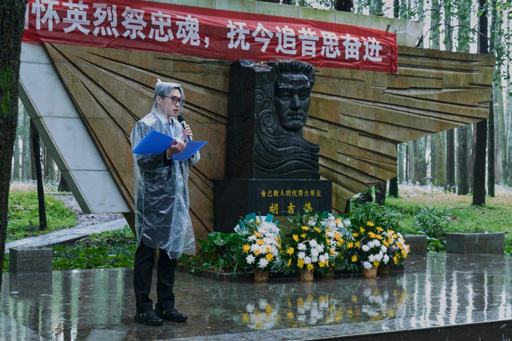 生命如花,责任无价。最美的花献给最可爱的人。与会领导和学生代表向胡吉伟塑像敬献花篮。风雨交加的天气,正如缅怀英烈的沉重心情,经院师生在庄严鞠躬中,对胡吉伟学长表示最深切的悼念和敬意。