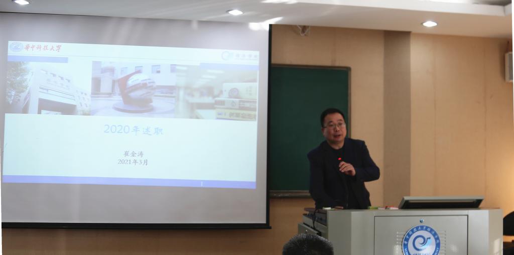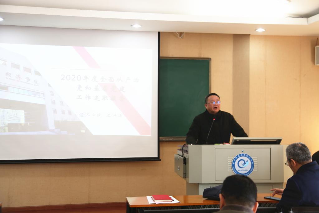 江洪洋书记做了《2020年度抓全面从严治党和基层党建工作述职报告》。他表示,学院党委坚持以习近平新时代中国特色社会主义思想为指导,以人为本,统筹推进疫情防控工作和教学科研工作,着力在“党旗领航、政治把关、立德树人、制度执行、改革发展”五个方面突出党委政治核心作用,取得了一些成效。面对目前存在的问题,江书记提出了坚定理想信念、严格政治把关、扎实思政工作、严格制度执行、推进“双一流”建设五点改进措施。