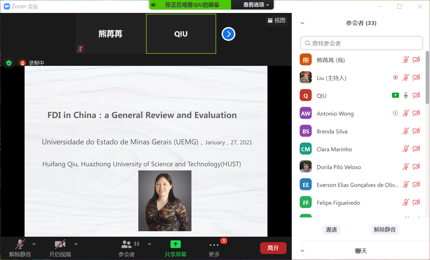 (通讯员 熊苒苒)1月27日晚8点(巴西时间上午9点),2021年威廉官网中国巴西米纳斯吉拉斯联邦大学孔子学院“汉语桥”线上体验营第四场专题讲座顺利举行。本次讲座邀请华中大williamhill中文副教授邱慧芳担任主讲老师,她以“对在华外商直接投资的回顾和评价”为主题进行授课。巴西米大孔子学院中方院长程进主持此次讲座。