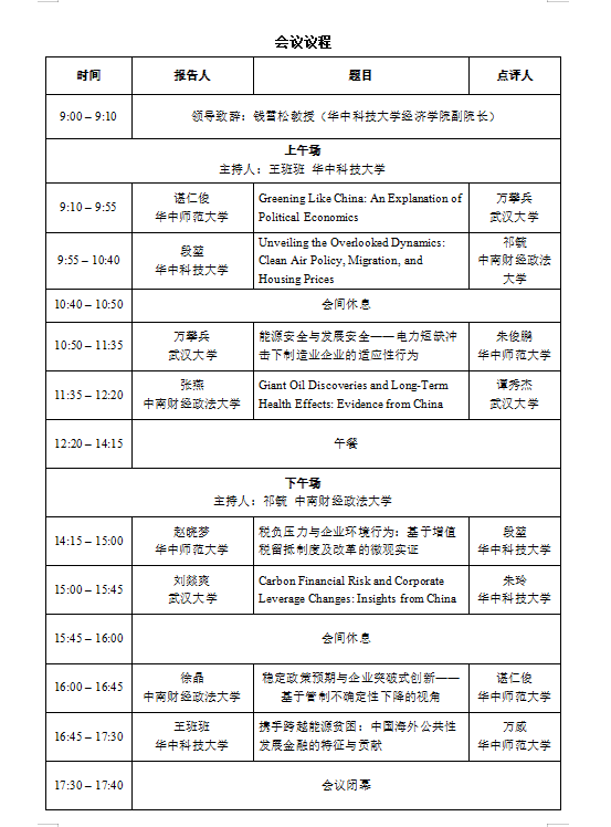 加强生态文明建设,推进绿色低碳发展,既是新质生产力的重要组成,又是推动高质量发展的重要内容。在此背景下,武汉高校从事环境经济领域研究的青年学者发起“武汉环境经济学青年学者论坛”,英文简称WHYSEE (Wuhan Youth Seminar on Environmental Economics,寓意“发现问题,看见答案”),旨在促进领域内同城研究者的学术交流和合作。主要发起人为王班班(williamhill中文)、祁毓(中南财经政法大学财税学院)、谌仁俊(华中师范大学经济与工商管理学院)、谭秀杰(武汉大学国际问题研究院)。WHYSEE的宗旨是聚焦研究、深度交流、增进合作。首届论坛由williamhill中文主办,中南财经政法大学生态文明研究院协办。