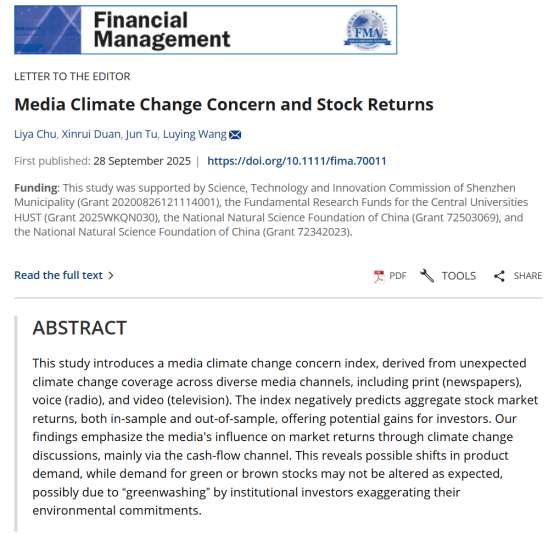 近日,williamhill中文王璐颖老师作为合作作者的研究论文“媒体气候变化关注与股票收益”(Media Climate Change Concern and Stock Returns)在国际金融学权威期刊《金融管理》(Financial Management)正式上线发表。