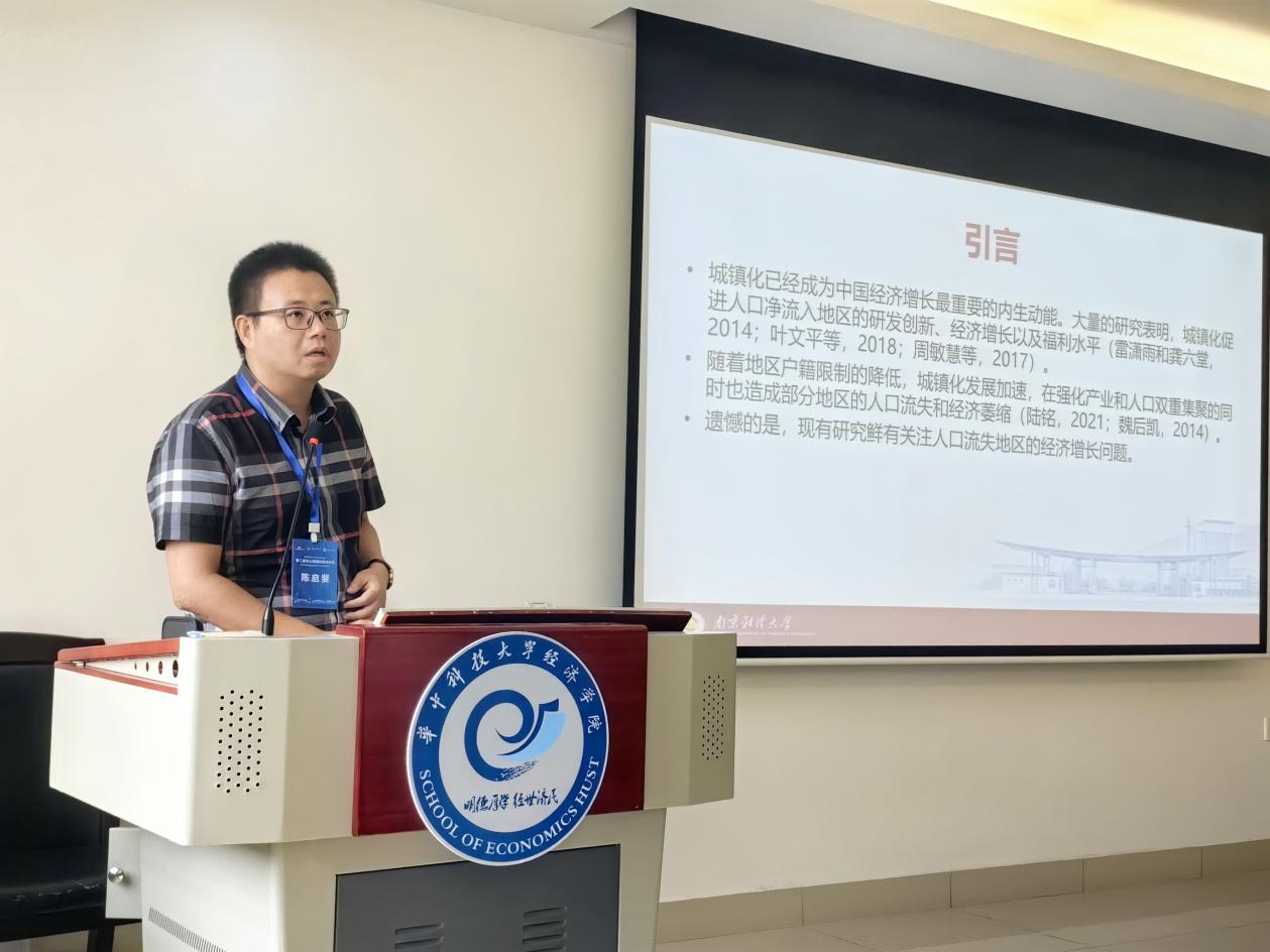陈启斐教授以《城市收缩的经济后果:基于2845个县级市的证据》为主题进行报告。该报告关注人口流失地区,采用2001-2019年中国2845个县级市的数据,更加细致地考察收缩型城市的经济增长问题。结果显示,城市收缩后经济增长下滑6.91%,农业、工业和服务业的增加值都有所下降,并且对服务业负面冲击最强。报告还从人均资本、全要素生产率、研发投入和消费需求等方面考察城市收缩对经济增长的内在影响机制,发现城市收缩抑制内陆地区的人均资本提升,但是会促进沿海地区人均资本。
