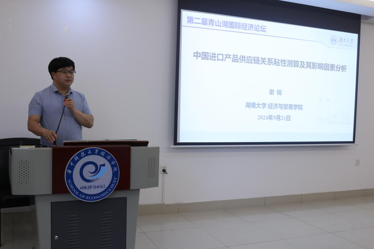 谢锐教授以《中国进口产品供应链韧性测度及其影响因素分析》为主题进行报告。该报告从供应链关系粘性起源的微观视角出发,构建关系粘性与贸易持续时间的结构方程,结合供应链网络化发展趋势,利用2000—2016年中国海关“企业—HS6—来源地—年”网络关系数据与随机模型—参数估计法测算中国HS6位码进口产品供应链关系粘性。该研究提供了一种测度进口产品供应链关系粘性的新方法,为供应链关系粘性文献奠定了坚实的实证基础。同时,对于供应链关系粘性影响因素分析,他得出结论:地理距离、关税不确定性、信息摩擦负向影响关系粘性,产品质量、贸易协定正向影响关系粘性。