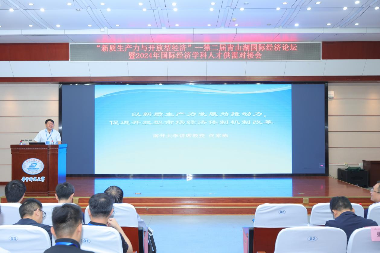 佟家栋教授以《以新质生产力为推动力,促进社会主义市场经济体制机制的改革中全会后的改革开放》为题探讨了在二十届三中全会之后,中国如何在新的国际形势下寻找适合自己的发展道路。他强调了生产力与生产关系的重要性,并指出了当前面临的挑战以及未来的行动方向。他提出,新的生产力要求中国的生产关系必须进行深入的、高质量的改革开放,为了适应新的生产力发展,必须有相应的生产关系作为制度保障。此外,他还讨论了开放型市场经济的重要性,包括多种所有制企业的平等地位、市场经济作为资源配置的主导者,以及政府在市场经济中的引导和协调作用。他认为中国将采取谨慎而坚定的步骤,以实现社会主义现代化的目标。