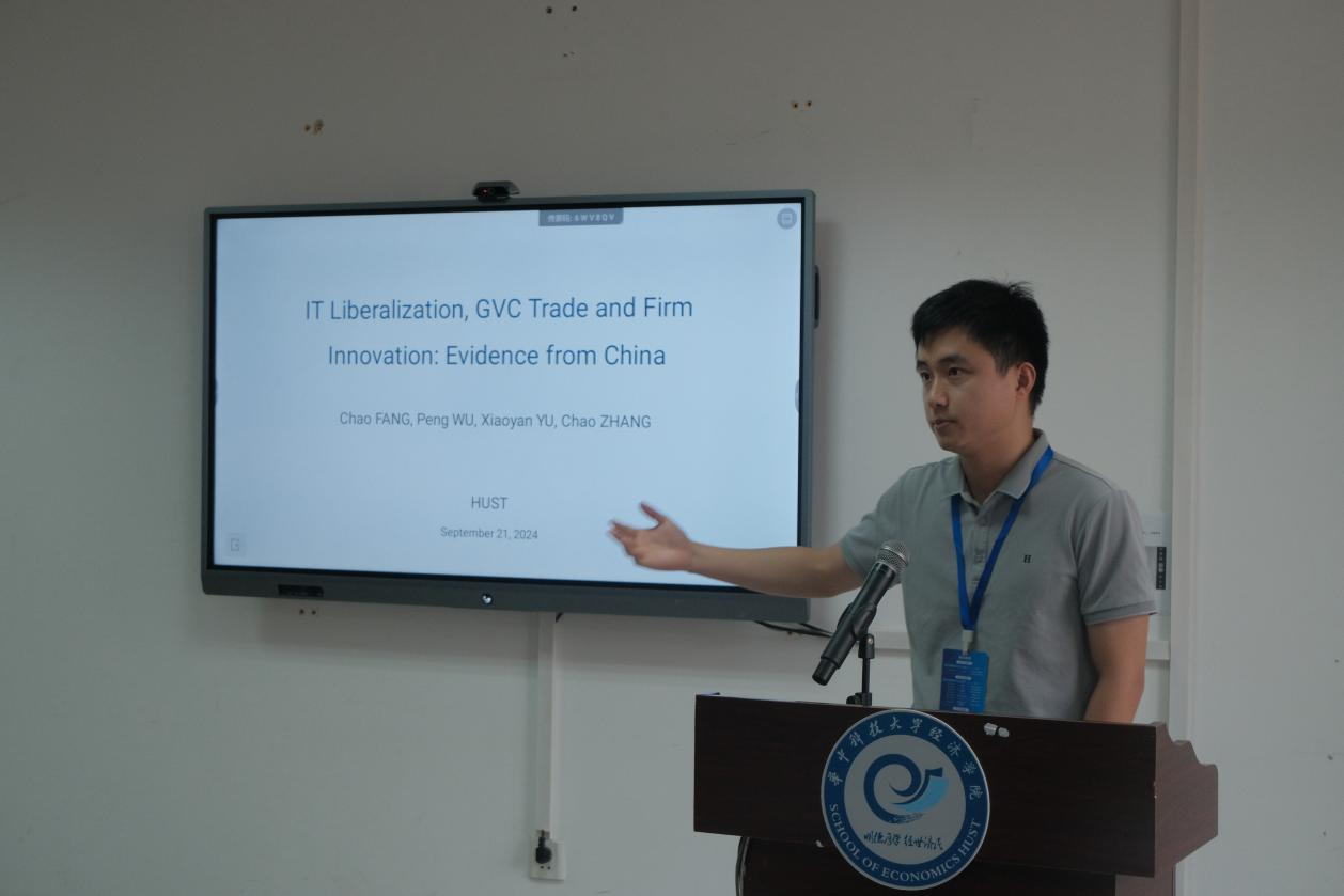 房超副研究员以《IT Liberalization,GVC Trade, and Firm Innovation: Evidence from China》为主题进行报告。他研究了建立在中国IT行业迅速发展的基础上,从国际国内的采购、生产、销售三方面层层分析企业发展与IT行业发展之间的关系。他认为,与信息技术关系更大的服务业在IT行业发展的过程中所受的影响更大。研究指出,中国的成功经验可以为其他发展中国家的IT行业贸易自由化进程提供参考依据。