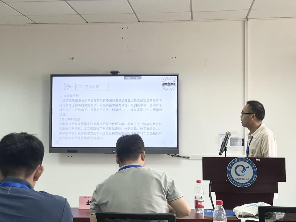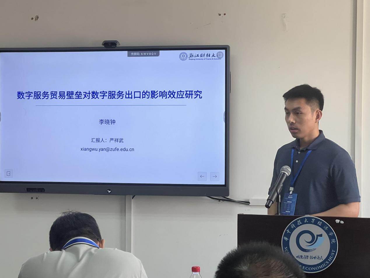 李裕鸿副教授以《数字贸易及互联网普及率对经济高质量增长的影响研究》为主题进行报告。该研究选取2011-2021年可代表我国30个省份(除西藏和港澳台数据外)数字贸易与经济高质量增长的面板数据,通过实证研究分析数字贸易对经济高质量增长的影响。研究表明数字贸易不仅能够推动经济高质量增长,还能通过促进互联网普及率对经济高质量增长产生正向影响。研究还提出了相应政策建议,提倡政府积极关注数字贸易对经济高质量增长的影响作用,结合不同地区的实际情况,制定差异化的政策,使数字贸易经对济高质量增长发挥出最高强度的驱动力,具有极大的现实意义。