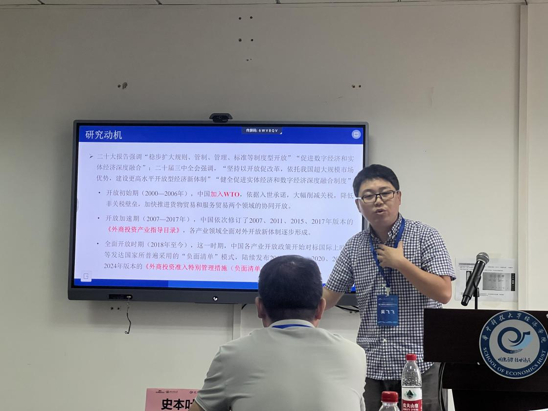 吴飞飞副教授以《数字产业开放与企业生产链本土化》为主题进行报告。他利用相关图表介绍了产业开放的历史进程与发展概况,阐述现今数字产业开放面对的问题,并指出我国经济贸易发展对数字产业开放有着迫切需求。文章通过构建函数与方程测算企业生产相关数据,控制影响因素,对数学模型与测算结果进行检验。研究得出结论,数字产业开放会显著促进制造业企业全球生产链延伸。数字产业开放引致企业数字化运营和数字技术创新来提升企业内部化生产能力,进而实现制造业企业全球生产链延伸。该研究阐述了数字产业开放对企业生产力发展具有重要推动作用,最后还从政府、企业等角度提出促进数字产业开放的可行性建议。