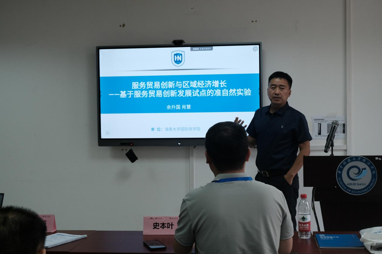 余升国副教授以《服务贸易创新与区域经济增长一基于服务贸易创新发展试点的准自然实验》为主题进行报告。他的研究利用2010-2021年283个城市的面板数据,通过双重差分法深入评估了服务贸易创新发展试点设立的经济增长效应,并对影响机制进行了实证检验。研究分析了服务贸易创新发展试点设立通过创新驱动效应促进区域经济增长、服务贸易创新发展试点设立通过企业集聚效应促进区域经济增长、服务贸易创新发展试点设立通过外商投资效应促进区域经济增长三个理论,运用基准回归与平行趋势检验和稳健性检验进行实证结果分析,得出一系列主要结论和政策启示。