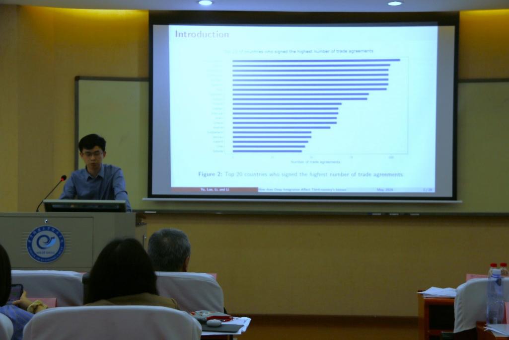 罗璇以《How does Deep Integration Affect Third-country's Innovation: Evidence from China》为主题进行报告。近年来,全球自由贸易协定(FTA)的签署数量迅速增长,但中国的参与仍然有限。文章通过分析各国之间FTA签署条款深度的差异,研究了中国各地区产业在暴露于外部FTA冲击下的创新表现,发现总体效果为负。进一步异质性分析显示,劳动密集型产业受负面影响最为严重,其次是资本密集型产业,而技术密集型产业则表现出正面影响,显示出更强的创新能力。在公司层面,专利数据分析表明,只有生产率较高或规模较大的公司才进行了更多创新,显示出企业的规模和生产率在应对外部FTA冲击时的重要性。