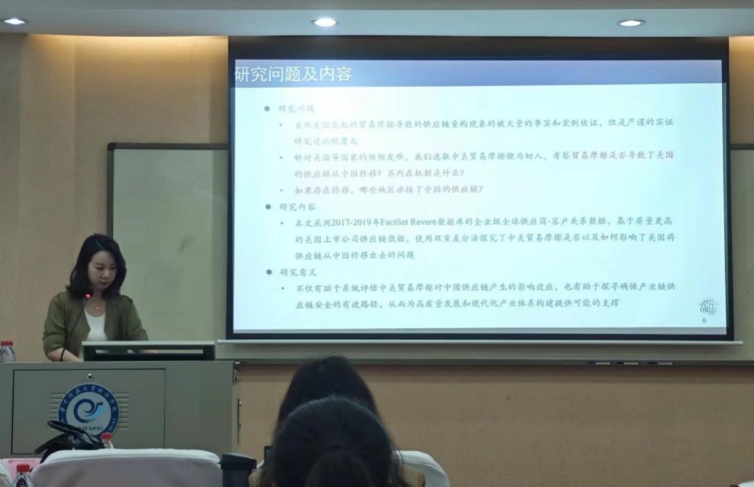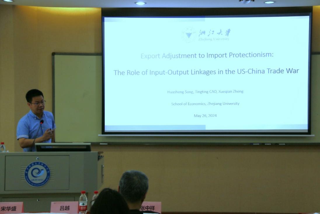 宋华盛以《Export Adjustment to Import Protectionism: The Role of Input-Output Linkages in the US-China Trade War》为主题进行报告。针对2018年以来美国对中国出口商品加征关税的行为,中国相应地对从美国进口的商品加征了报复性关税。文章利用2017年1月至2019年12月的中国海关分类数据,分析了中美贸易战中中国出口企业如何应对中国的报复性关税。实证结果表明,中国报复性关税的进口冲击会沿生产链传导至出口,导致中国出口到第三市场的产品价值和价格同时下降,产生纵向溢出效应。报复性关税对不同产品的影响具有异质性,表现在出口双边际、贸易模式和企业所有权方面的差异。机制分析阐明了出口质量下降效应在转嫁中的突出作用,其决定性作用超过了竞争效应的影响。