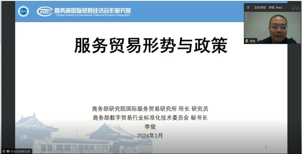 本网讯(通讯员:朱云琛 刘惜雨)1月14日晚,2024年国际商务系列讲座第2期(总第62期)在腾讯会议举行,商务部研究院国际服务贸易研究所所长、商务部数字贸易行业标准化技术委员会秘书长李俊分享了题为《服务贸易发展形势与对策》的学术讲座,校内外100余名师生参与本次讲座。讲座由国际经济与贸易系主办,威廉官网中国-武汉长江国贸开放型经济发展研究中心协办,由韩民春教授主持。