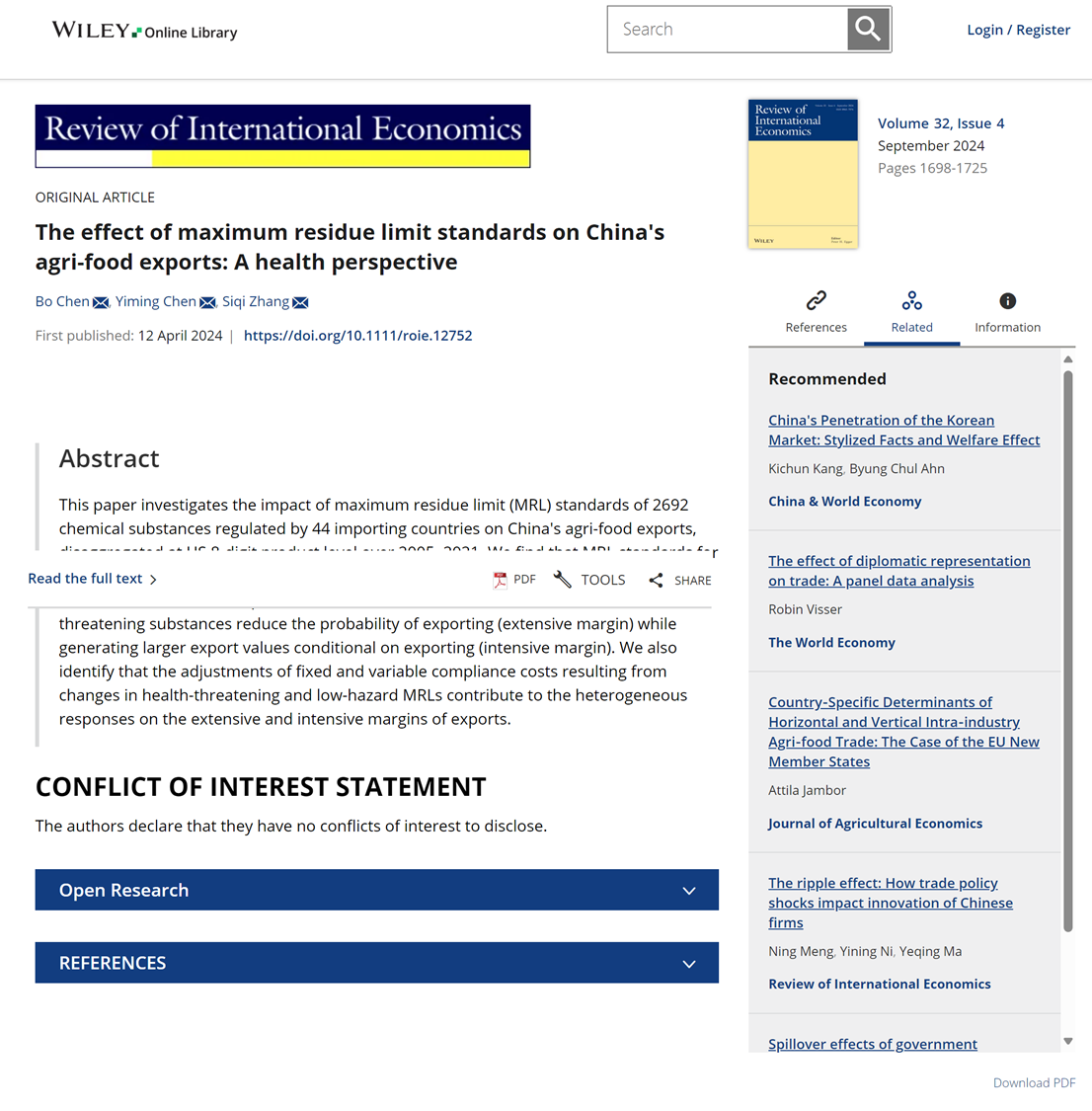 此外,近年来,陈波教授团队学术成果显著,其与williamhill中文博士陈一鸣、williamhill中文助理教授张斯琦的合作研究成果“The effect of maximum residue limit standards on China's agri-food exports: A health perspective”在《Review of International Economics》上发表;独作“Why does international vertical specialisation affect within-firm skill premium in China? Investigation and interpretation”在《The World Economy》上发表。