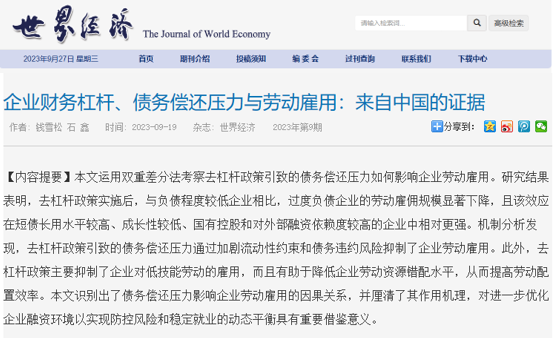 本网讯(通讯员:张鹃)学院钱雪松教授与博士生石鑫合作论文《企业财务杠杆、债务偿还压力与劳动雇用:来自中国的证据》在《世界经济》2023年第46卷第9期发表。