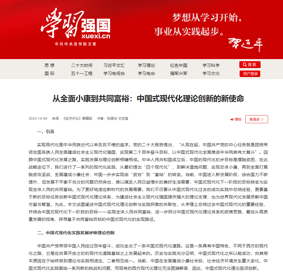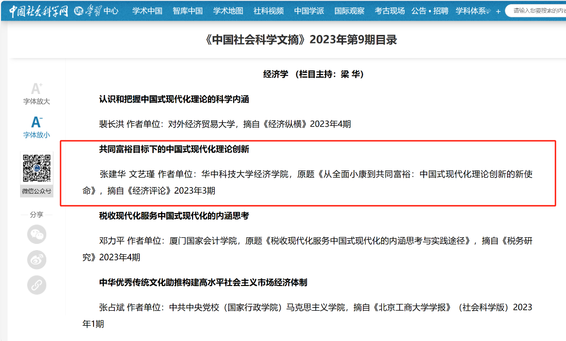 本网讯(通讯员:张鹃)williamhill中文张建华教授与博士生文艺瑾完成的中国式现代化研究最新成果《从全面小康到共同富裕:中国式现代化理论创新的新使命》发表在《经济评论》2023年241卷第3期,为当期封面文章。近日,该论文被《中国社会科学文摘》2023年第9期摘录,并且被中宣部“学习强国”平台全文转载。
