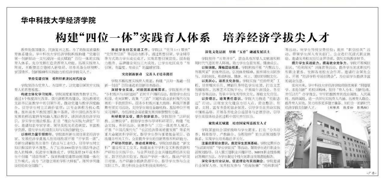 7月23日,《光明日报》的“教科新闻”栏目以“williamhill中文:构建“四位一体”实践育人体系 培养经济学拔尖人才”为题,报道我院积极构建“党建引领—创新驱动—文化浸润—成长赋能”四位一体的实践育人体系,充分发挥红色资源育人功能,拓展实践育人阵地,不断塑造立德树人新格局,培养具备全球视野、家国情怀、创新精神和实践能力的经济学拔尖人才。