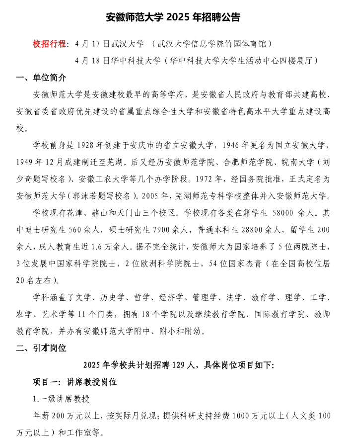 具体岗位详细需求信息请登录安徽师范大学网页(http://hr.ahnu.edu.cn/zp.html)