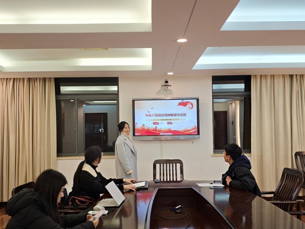 支部成员杜同悦带领大家学习中央八项规定精神。党中央决定,自2025年全国两会后至7月在全党开展深入贯彻中央八项规定精神学习教育,这是巩固深化主题教育和党纪学习教育成果、纵深推进全面从严治党的重要举措,是密切党群干群关系、巩固党的执政基础的必然要求。党的十八大以来,以习近平同志为核心的党中央从制定和落实中央八项规定开局破题,坚持自上而下、以上率下,解决了新形势下作风建设抓什么、怎么抓的问题,以“小切口”推动“大变局”,党风政风和社会风气焕然一新。对中央八项规定精神的学习,使支部党员提升思想认识,把中央八项规定精神扎根心中、更加自觉,确保思想不脱节、方向不跑偏、行动不掉线,持续提升“政治三力”,将中央八项规定内化为日用而不觉的言行准则。