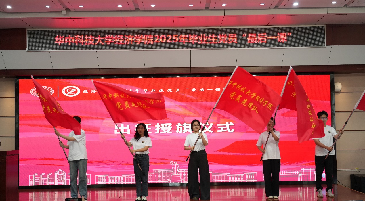 刘雅然为本科生、研究生毕业党员代表赠送入党纪念牌,鼓励毕业生党员们不忘初心,在今后的道路奋勇前行。刘雅然为东、西、南、北、中部毕业生党员代表授予出征旗帜,希望毕业生党员们在祖国需要的地方绽放青春华彩。