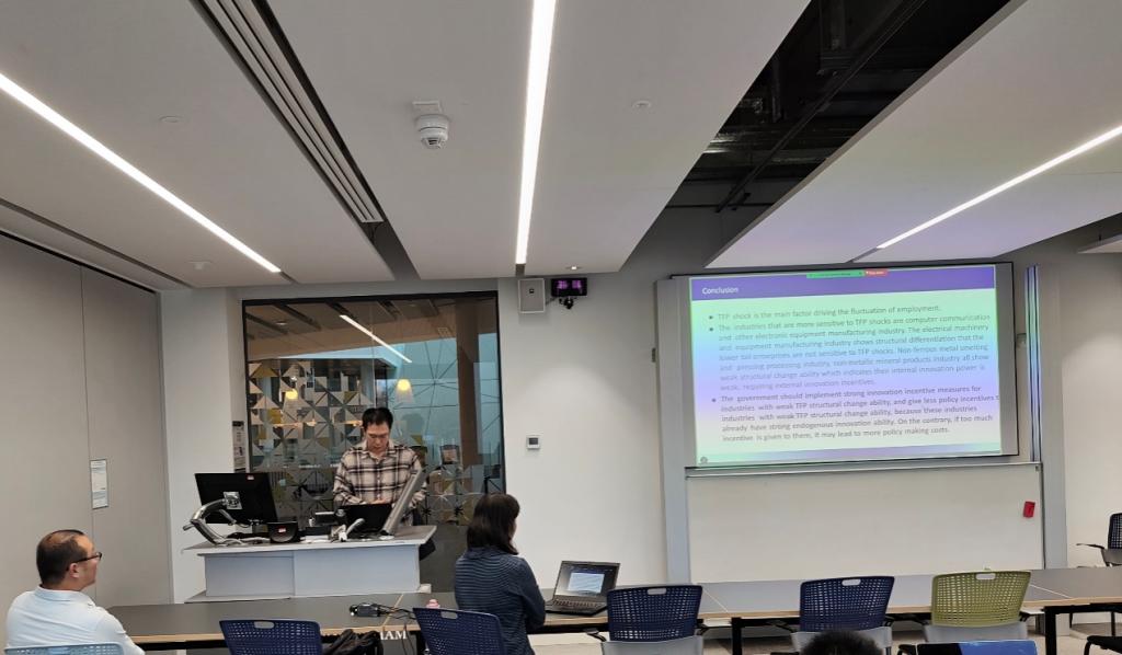 在12月10日举行的“金融与数量经济学博士生学术交流研讨会”上,双方师生分别展示了各自的研究成果,并进行了深入讨论。本次研讨会的议题涵盖多学科领域。在上午的议程中,涉及了数据驱动学习框架、经济增长模型以及中国制造业全要素生产率(TFP)冲击效应等内容。