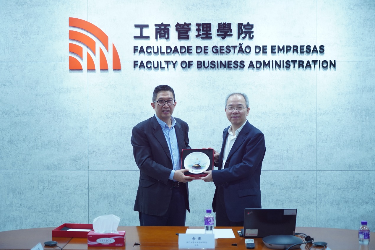 张建华院长代表我院与澳门大学工商管理学院余俊院长互赠礼品