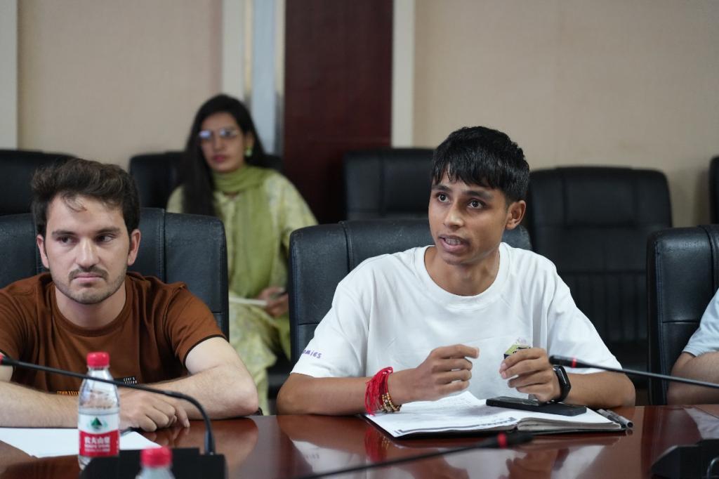 新生代表发言中,来自柬埔寨的国际贸易学硕士新生陈健华分享了自己在华科大的5年求学故事。他提到早在2018年,自己只身来到华科大学习,顺利拿到学院的本科学位。如今怀着满腔期待再次回到这里,期望在未来的学习中进一步提升自己,收获新的知识与见解。来自印度的国际贸易学博士新生克齐发言。他认为自己热爱中国文化,在华学习期间已经逐步具备较好的中文基础,愿意在今后的学习生活中帮助同学们解决语言上的沟通障碍。他也表达了对未来学习的期待,立志通过学业助力祖国的繁荣发展。
