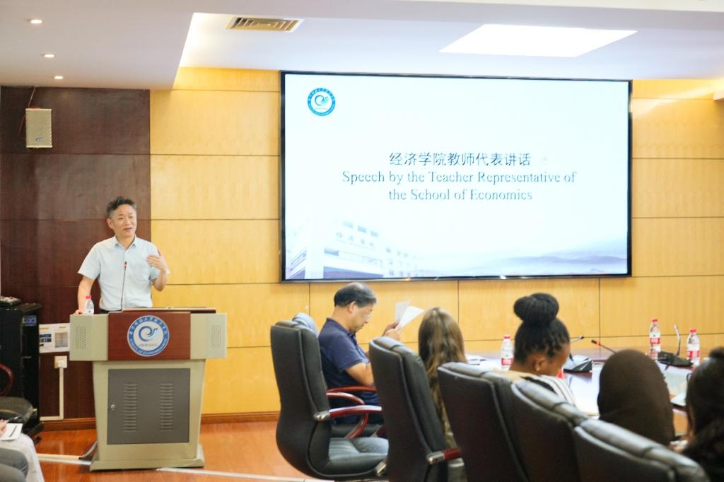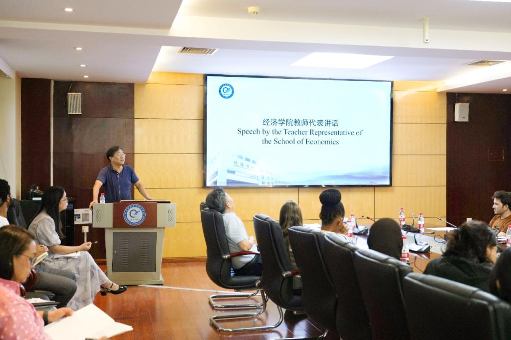 教师代表发言环节,国贸系主任范红忠热烈欢迎了国际学生的到来,并特别鼓励大家在学习专业知识的同时,逐步了解中国文化和语言。他认为语言是了解文化和融入社会的桥梁,掌握中文能够帮助国际学生更好地适应在华的学习和生活。同时他也鼓励同学们要树立明确的学术目标,保持积极的学习态度,积极参与学术研究,争取发表高水平的学术论文。