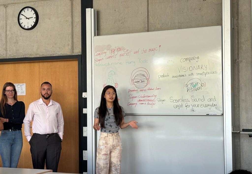 按国籍混合编组进行商务模拟竞赛是本项活动的传统内容之一。在本次活动学术指导、东道国Nitsch教授的组织下,来自四个国家的学生被打乱进行混合分组,分别模拟成立一个智能耳机公司并通过多轮投资进行竞技。各个小组首先为自己的公司及其产品命名,同时畅想其产品的独特功能并为其设计Logo。接着在多轮游戏中各个小组内部讨论确定产品的价格、产量、公司的融资方式、是否更新换代等,最后由电脑测定成绩,利润最高组获胜。在一轮又一轮的跨文化沟通交流中,同学们互相启发,通力合作,培养并提高了跨国合作的能力与水平。