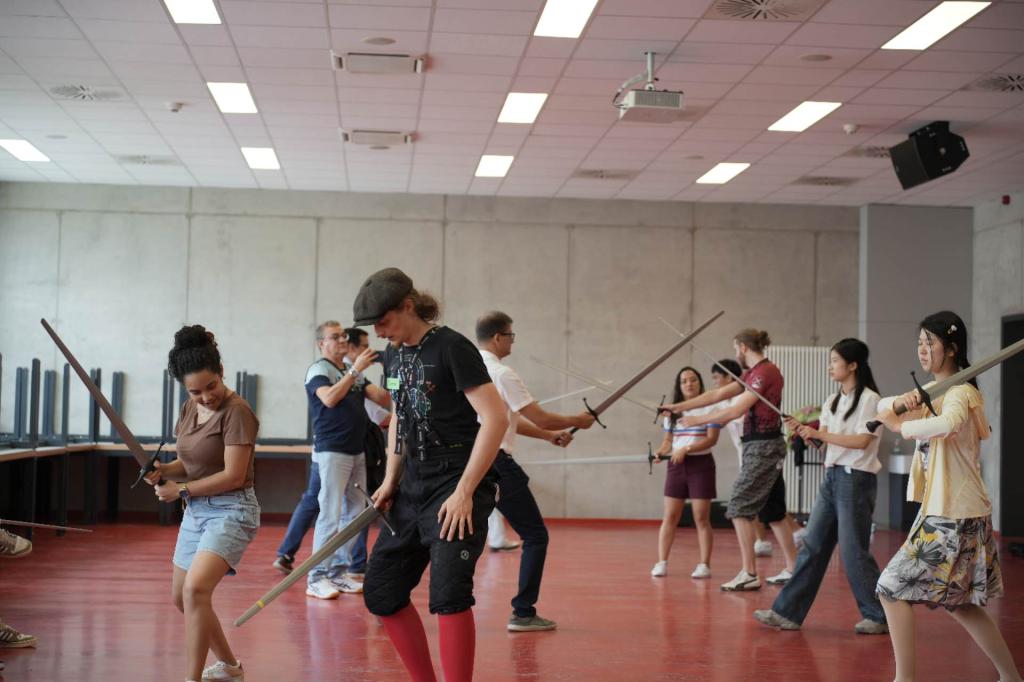此外,DHBW大学还为同学们安排了一场沉浸式的中世纪击剑活动,同学们在专业人士的指导下分别体验了花剑和双手巨剑的基本操作和手法,对这项古老而又优雅的运动有了深入的了解与认知。