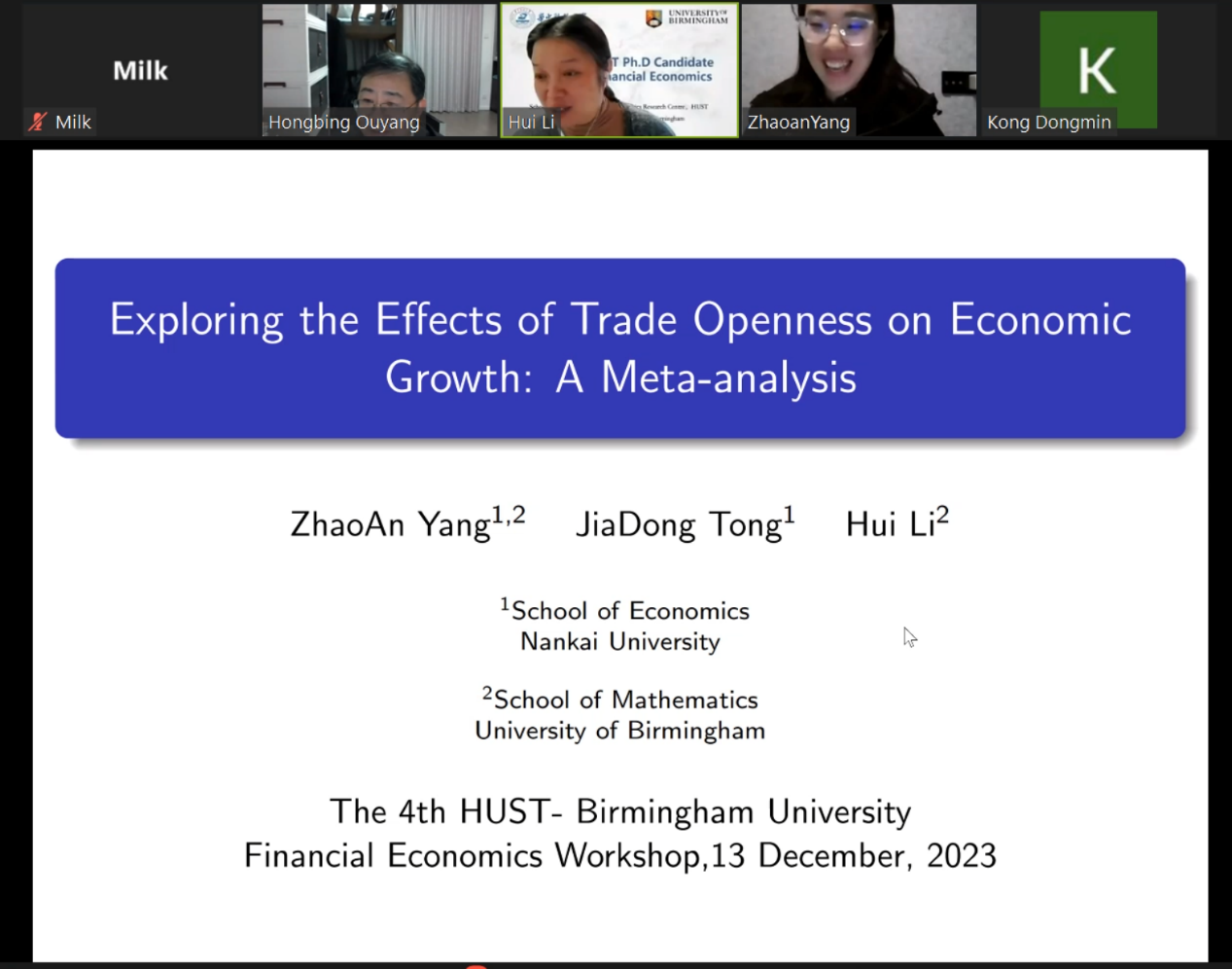 本网讯(通讯员 张鹃)2023年12月13日,第四届威廉官网中国—英国伯明翰大学博士生金融经济学学术论坛于ZOOM线上会议顺利举办。双方大学的师生就其研究的论文进行了分享和讨论,近三十位博士生导师和博士生参与了论坛交流和讨论。