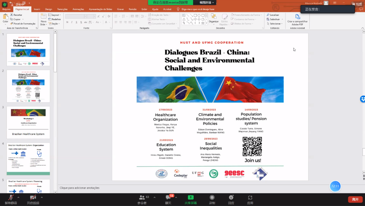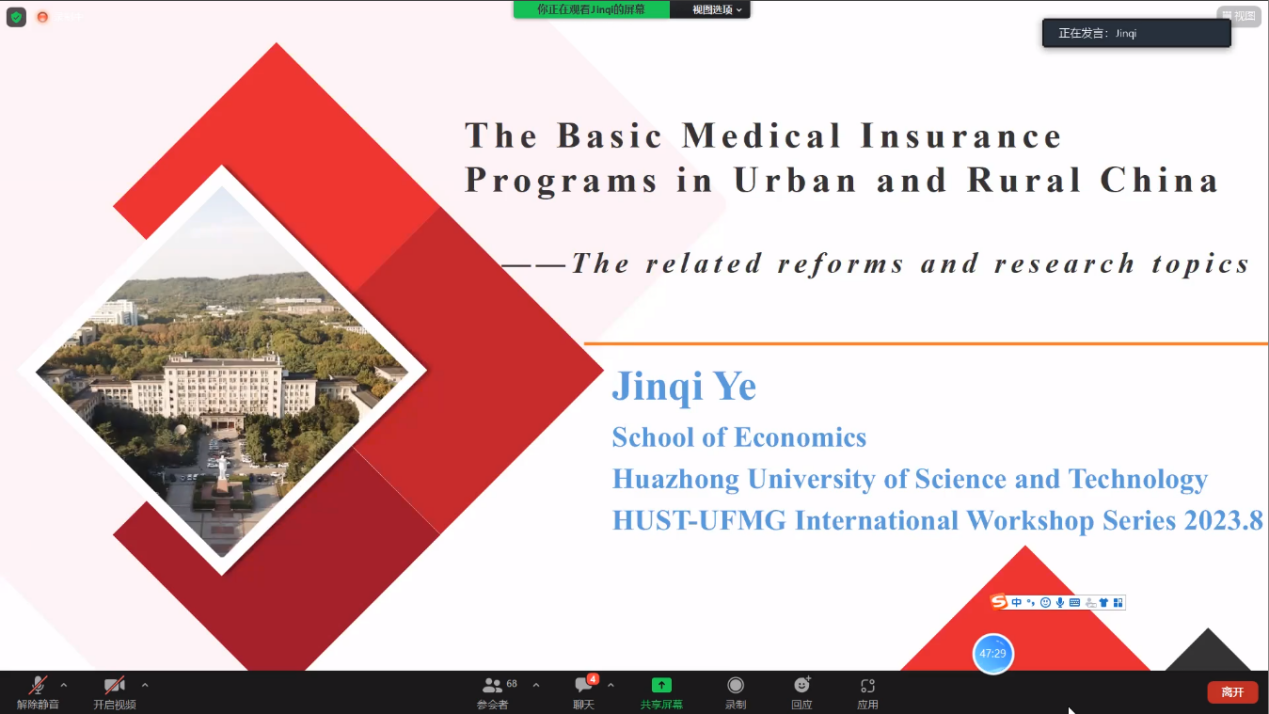 本网讯 (通讯员:刘惜雨)HUST-UFMG国际专题系列研讨会第一场以Brazil and China: Health Insurance, Hospital Organization, and Medical Reforms(对话巴西:医疗保险、医院组织与医药改革)为题的专题研讨于2023年8月17日晚19:00在线上举行。参加本次会议的有来自巴西米纳斯吉拉斯州联邦大学williamhill中文的Monica Viegas教授与Kenya Noronha教授,巴西米纳斯吉拉斯联邦大学孔子学院的刘毅教授以及来自williamhill中文的叶巾祁老师和孙雅老师。学院全体国际学生参与了此次专题研讨。