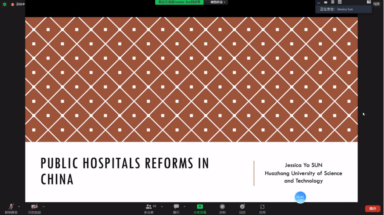 紧接着,由叶巾祁带来题为《The Basic Medical Insurance Programs In Urban and Rural China》的主题演讲,为大家讲解中国城乡基本医疗保险制度的相关内容。她首先介绍了中国医疗保险的现状。中国的公共卫生信息系统已经基本实现了全民覆盖,2018年2月中国第六次国民健康服务调查表明覆盖率已达到96.8%,且2022年全国基本医疗保险的总收入相较于前一年增长了7.6%。中国有城镇职工基本医疗保险与农村基本医疗保险两个主要医疗保险项目,并且两者在覆盖人群、资金来源与保险机制设计存在差异。第二,她讲解了中国医疗保险制度改革历程。伴随着市场经济体制改革和农村生产方式变化,医疗保险制度也需要随之进行重建改革。通过1998年城镇职工基本医疗保险、2003年新型农村合作医疗计划、2007年纳入所有其他城市非就业居民到社会医疗保险,2016年整合城乡居民基本医疗保险四个主要步骤来建立全民医保。叶巾祁还结合一些中国医疗保险相关文献研究,指出大多数文献发现中国医疗保险改革对居民健康、医疗保险使用等方面产生了积极影响。最后,叶巾祁强调了中国城乡医疗一体化背景下医保基金统筹层次差异化、医疗保险制度快速转型的长短期影响以及医疗系统的高质量发展等热门话题,并提出未来要积极对比中外医疗保险、结合大数据和科学方法的研究期许。