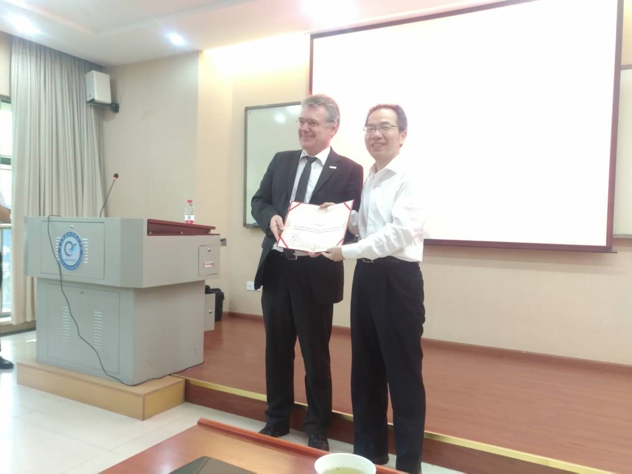 本网讯(通讯员:王班班)5月21日,德国杜伊斯堡∙埃森大学商学院教授、东亚高等研究院院长、德国鲁尔孔子学院德方院长Markus Taube教授来访我院并受聘我院荣誉教授。院长张建华教授颁发了聘书。