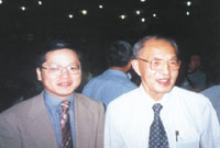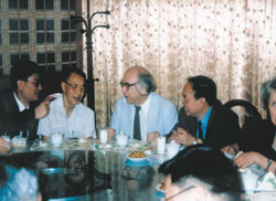 我校名誉教授、国际著名经济学家赫尔维茨( L. Hurwicz )教授和我校原校长、现教育部部长周济(院士)亲切交谈
