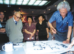 | | 我校名誉教授、国际著名经济学 家张五常 教授在我校讲学期间为我院师生展示其书法