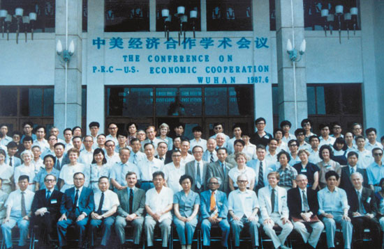 1987 年 6 月 29 日 — 7 月 2 日 ,张培刚教授,林少宫教授和美国亚洲经济研究会主席杜塔( J. Dutta )教授共同主持的“中美经济合作学术会议”在我校召开。图为出席会议的中外代表合影。
