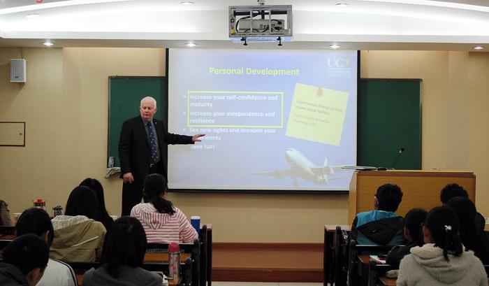 4月7日下午2点院103教室,来自新西兰坎特伯雷大学商学法学院副院长凯文•福格斯教授为我院2012级本科生详细介绍了坎特伯雷大学“2+2交流项目”,从四个方面讲述交流项目的优势。第一,他肯定中西两种不同的教育方式,他认为两者融合才能有最好的教育,交流项目正好提供了这样的一个平台;第二,交流项目对学生完善个人修养有很大益处,过程中可以与不同思想碰撞、开阔眼界;第三,坎特伯雷大学学习环境优美清幽,建筑历史感强,校园设施现代化,是个理想的治学之地;第四,坎特伯雷大学师资强大,例如2003年诺贝尔经济学奖得主在学校都设有专门的研究所。进入坎大学习并顺利获取学位的同学,在申请海外名校研究生时将有很大优势,此外坎大还将推荐优秀的学生进入牛津大学、剑桥大学等高校深造。活动结束后,福格斯教授向同学们发放交流项目宣传册,并与几位同学做了台下交流。